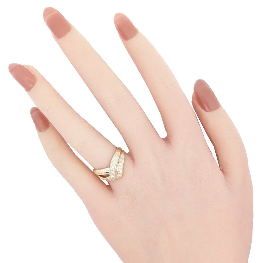 K18素材に、ダイヤモンドをあしらったリングです。流れるような曲線が特徴的なデザインに、上質なダイヤモンドをあしらったエレガントなリングで、光を受けてきらめくダイヤモンドは、指元に華やかさと上品さを添えます。 |
