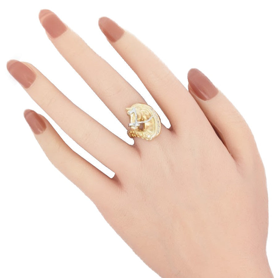 コメント K18とプラチナ素材に、ダイヤモンドをあしらったリングです。立体的なフォルムによって馬の細部まで表現されています。ダイヤモンドは、たてがみの流れをイメージするようにセッティングされ、小粒ながらも上品な存在感を放ちます。馬は、縁起の良いモチーフとして知られ、身につける人の運気を高め、挑戦の場での力強いお守りになるともいわれています。