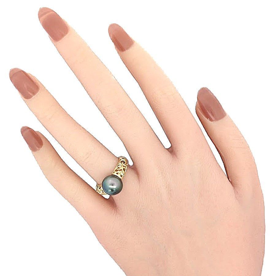 K18素材に、ブラックパール・ダイヤモンドをあしらったリングです。深みのあるブラックパールの艶やかさを引き立てるように、アーム部分はレースのような透かし模様でデザインされ、軽やかで上品な印象を添えています。ブラックパールは「守護」や「深い愛」を象徴するとされ、その奥行きある色彩は角度によってブルーやグリーンの光を帯び、唯一無二の存在感を放ちます。さらに、煌めくダイヤモンドがその神秘性に華やかさを加え、指先に凛とした輝きをもたらします。 |