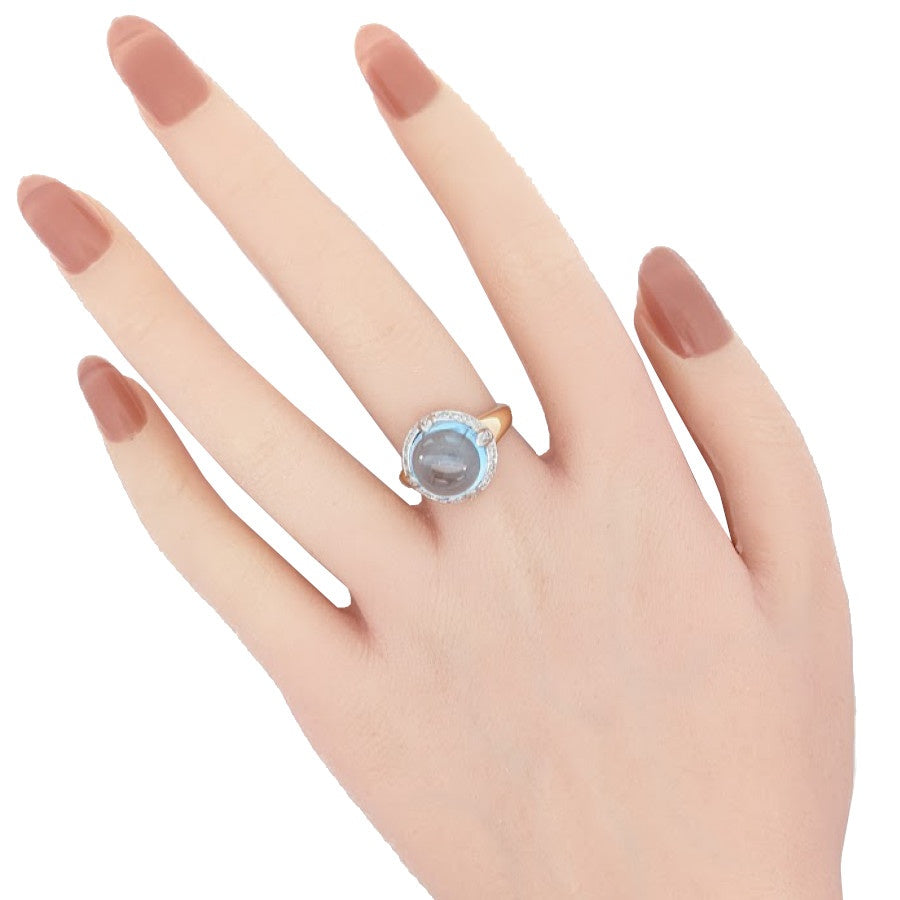 K18/プラチナ素材に、ブルートパーズ・ダイヤモンドをあしらったリングです。透明感あふれるブルートパーズを贅沢にセッティングした、存在感抜群のリングで、大粒のブルートパーズはカボションカットで仕上げられ、瑞々しい水滴のような輝きを放ちます。石を囲むようにセッティングされたメレダイヤモンドが、澄んだブルーの輝きをさらに引き立て、手元に華やかさと気品を添えます。 |