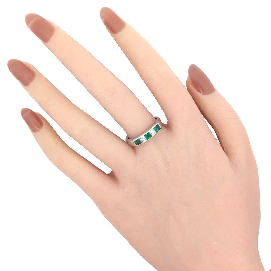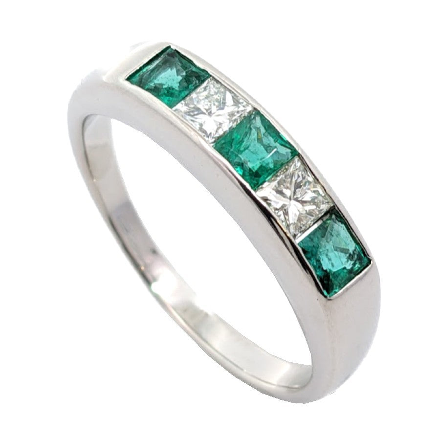 プラチナ素材に、エメラルド・ダイヤモンドをあしらったリングです。深みのあるエメラルドの輝きと、ダイヤモンドの透明感が絶妙に調和し、上品で気品ある印象を演出します。プラチナの重厚な光沢が、宝石の色彩をより一層引き立て、洗練された存在感を放ちます。クラシカルでありながらモダンなデザインです。 |