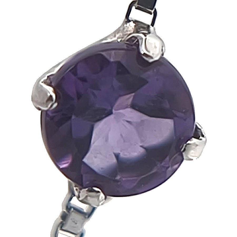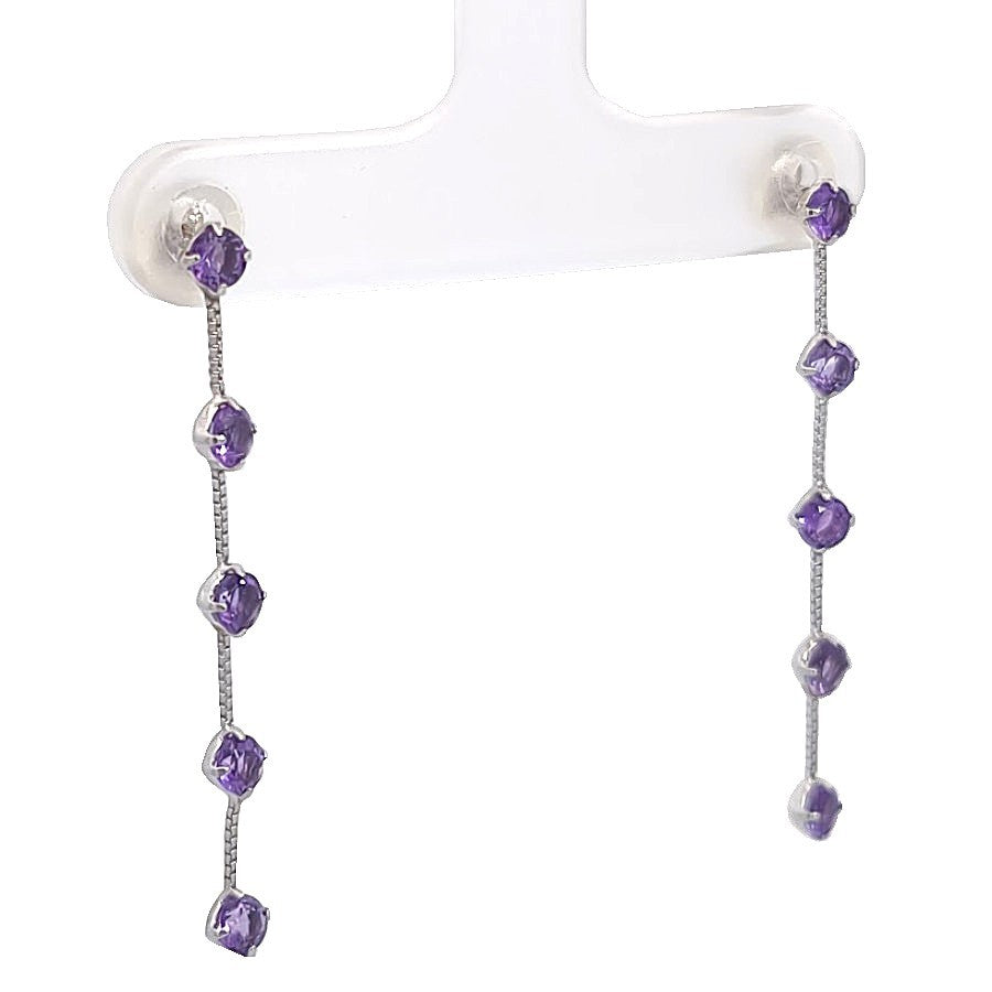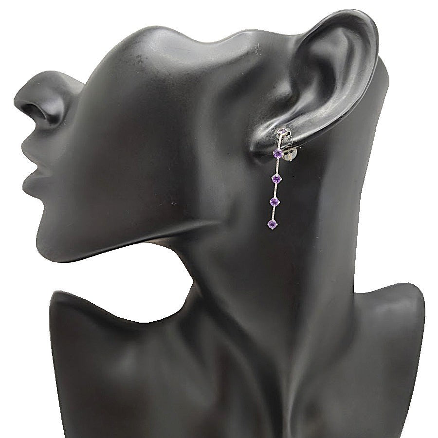 K14ホワイトゴールド素材に、アメジストをあしらったピアスです。透き通るような紫の輝きが、縦に連なるデザインをより繊細に引き立て、耳元にすっきりとした印象を与えます。