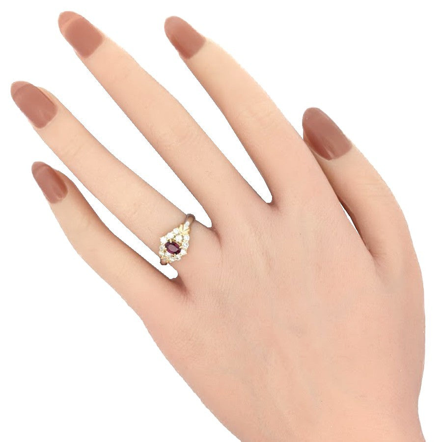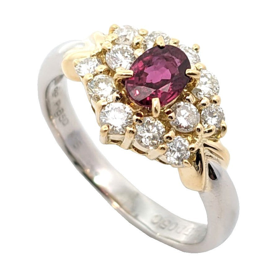 K18/プラチナ素材に、ルビー・ダイヤモンドをあしらったリングです。ゴールドの温かみが絶妙に調和し、指先に華やかで洗練された印象をもたらします。中央のルビーは深く情熱的な赤を湛え、その鮮やかな輝きがダイヤモンドの光と相まって、手元に優雅な存在感を演出。繊細に配置されたダイヤモンドが光を受けてきらめき、リング全体に立体感と高級感を添えます。 |